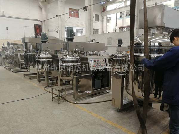 物料在水鍋、油鍋內(nèi)通過加熱、攪拌進行混合反應(yīng)后,由真空泵吸入乳化鍋,通過乳化鍋內(nèi)上部的中心攪拌、聚四氟乙烯刮板始終迎合攪拌鍋形體,掃凈掛壁粘料,使被刮取的物料不斷產(chǎn)生新界面,再經(jīng)過葉片的剪斷、壓縮、折疊,使其攪拌、混合而向下流往鍋體下方的均質(zhì)器處,物料再通過高速旋轉(zhuǎn)的切割輪與固定的切割套之間所產(chǎn)生的強力的剪斷、沖擊、亂流等過程,物料在剪切縫中被切割,迅速破碎成200um-0.2um的微粒,由于乳化鍋內(nèi)處于真空狀態(tài),物料在攪拌過程中產(chǎn)生的氣泡被及時抽走。采用抽真空的方式,使所生產(chǎn)的制品在攪拌過程中不再混入氣泡,從而保證可制造出富有光澤、細膩及延展性良好的產(chǎn)品。